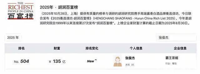 张俊杰本人也于2025年以135亿元身家登上胡润百富榜,身家不容小觑。