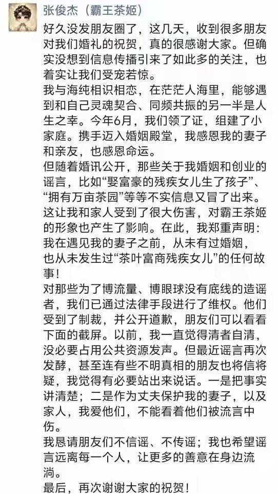 受到舆论压力的影响,也为了保护妻子不再受流言的伤害,张俊杰主动出面解释。